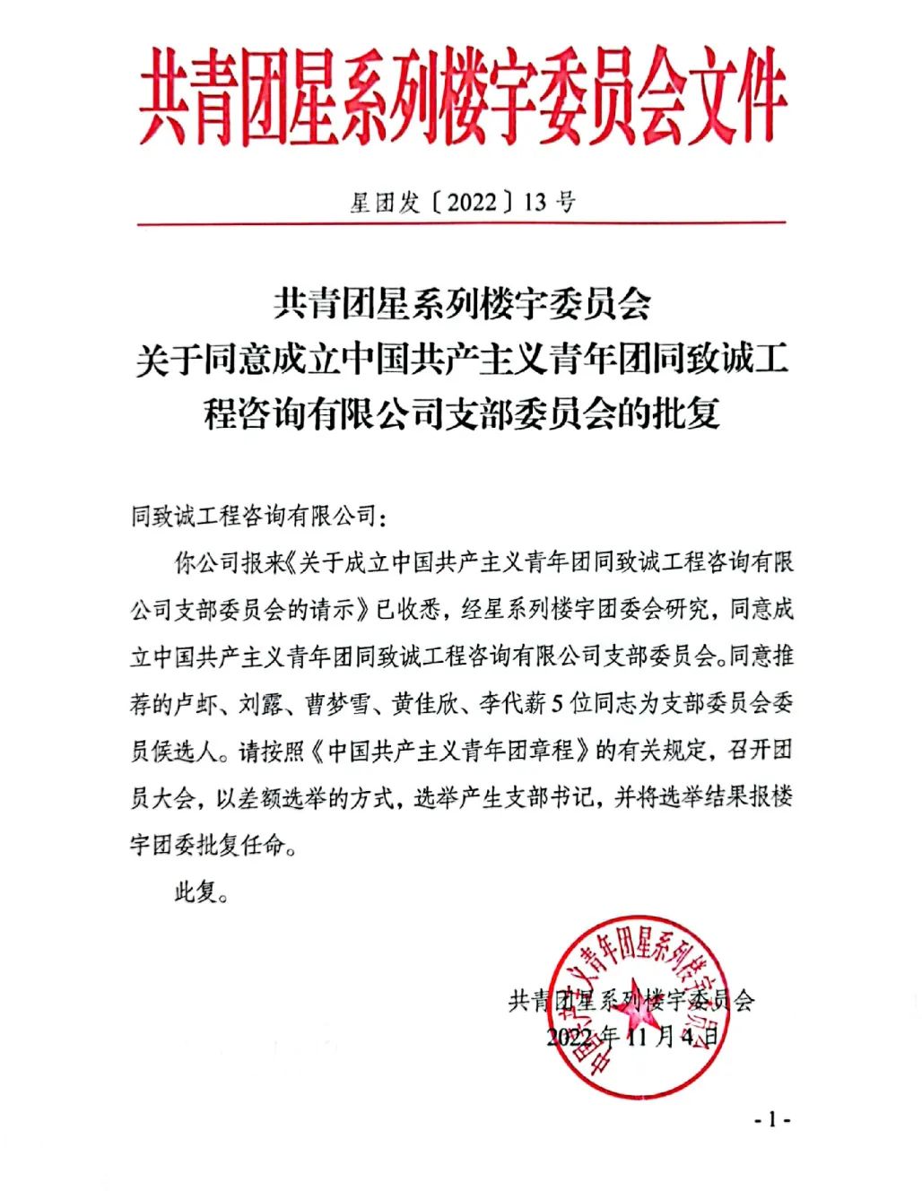 關(guān)于同意成立中國(guó)共產(chǎn)主義青年團(tuán)同致誠(chéng)工程咨詢有限公司支部委員會(huì)的批復(fù)