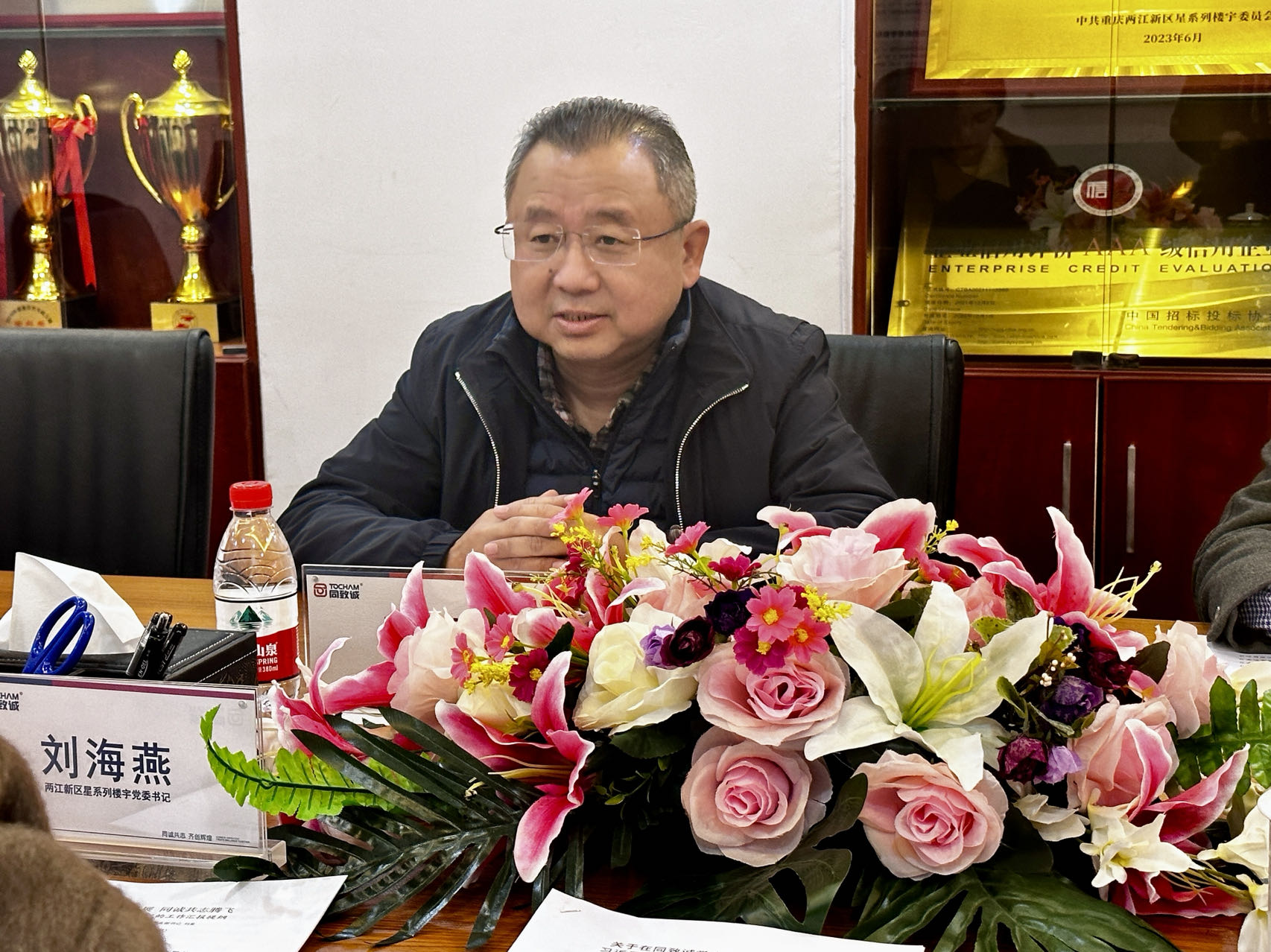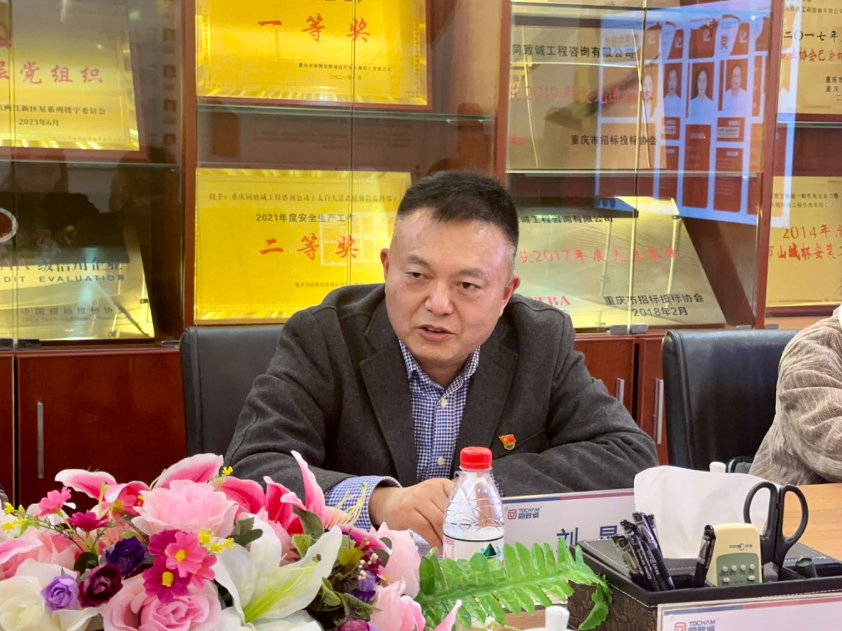 會上,張董事長對劉書記的到訪表示熱烈歡迎和感謝,并從集團公司工程咨詢、檢測、產教融合、海外事業四大版塊做了全面介紹。張董事長說:“2003年,我開始創業,經過20年的發展公司取得了一些成績,黃桷灣立交、重慶江北國際機場T3航站樓等等都有同致誠的身影。但是現在受大環境影響,企業經營有一定的困難,也希望黨委、政府多支持民營企業發展。”