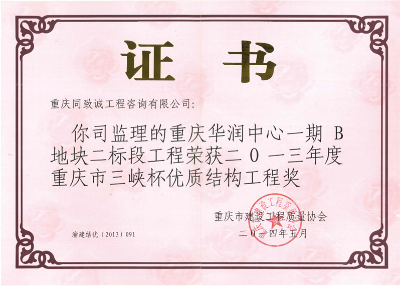 2013年重慶市三峽杯優質結構工程獎“華潤中心一期B地塊二標段”
