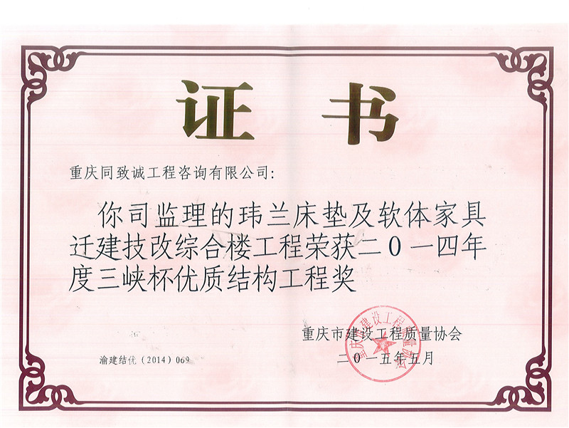 瑋蘭床墊及軟體家具遷建技改綜合樓工程榮獲二0一四年度三峽杯優質結構工程獎