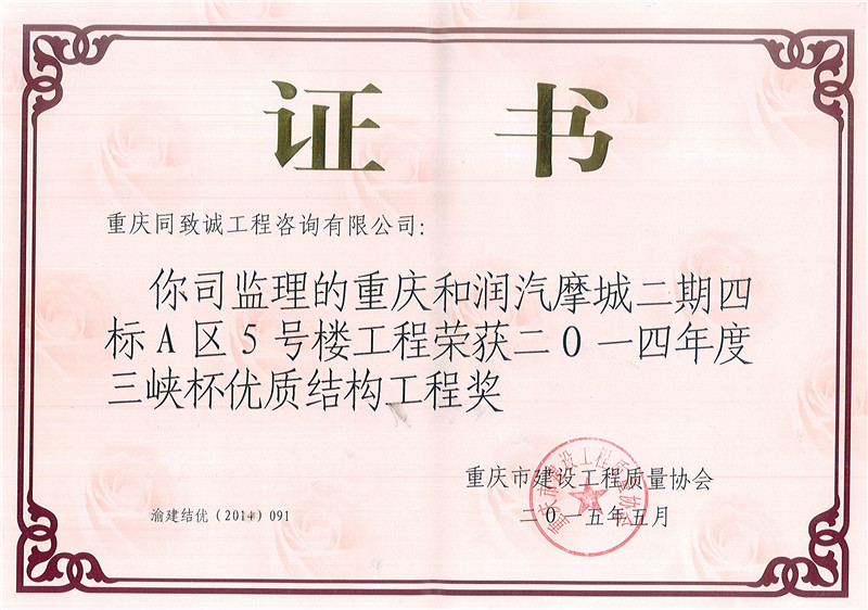 重慶和潤汽摩城二期四標A區5號樓工程榮獲二0一四年度三峽杯優質結構工程獎