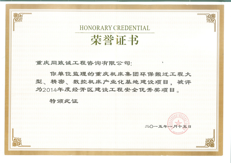 重慶機床集團環保搬遷工程大型、精密、數控機床產業化基地建設項目被評為2014年度經開區建設工程安全優秀獎項目