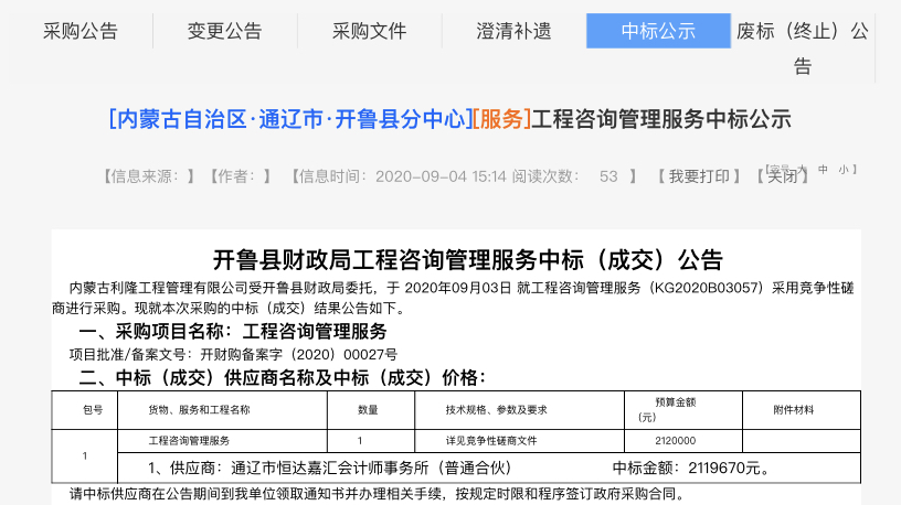 202093日,重慶同致誠工程咨詢有限公司與通遼市恒達嘉匯會計師事務所組成聯合體,中標“開魯縣財政局工程咨詢管理服務” 供應商,中標金額為2119670元。