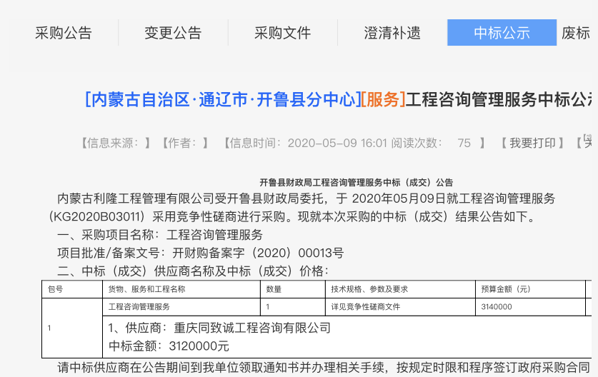 202059日,重慶同致誠工程咨詢有限公司中標“開魯縣財政局工程咨詢管理服務” 供應商,中標金額為3120000元。