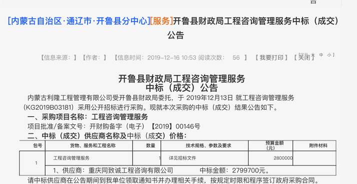 20191213日,重慶同致誠工程咨詢有限公司中標“開魯縣財政局工程咨詢管理服務” 供應商,中標金額為2799700元。